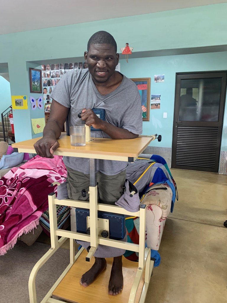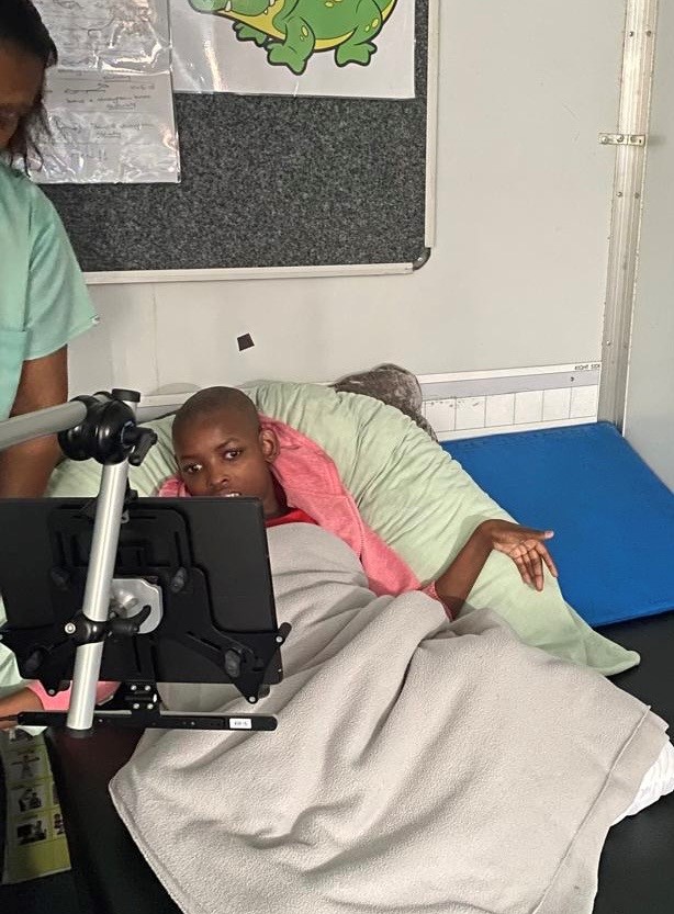 Here is one of our residents being helped by the rehab team to make use of our standing frame and another learning to communicate using the Eye Gaze. Thanks to the team from Interface for helping her with this new skill.