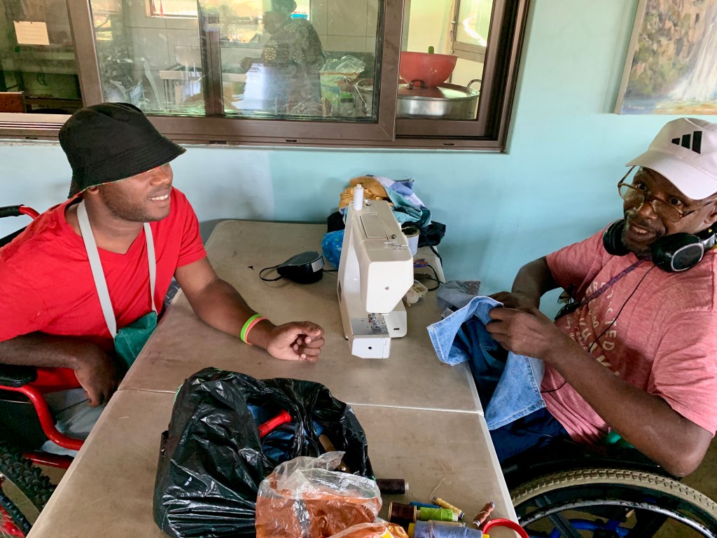 Although our sewing circle has not got going quite as strongly as we want yet I have to say that I am impressed by the determination of some of our residents to make use of the skills which they have learnt. Here are Justice and Sbonelo M assisting by repairing clothes form people at Philakade.
