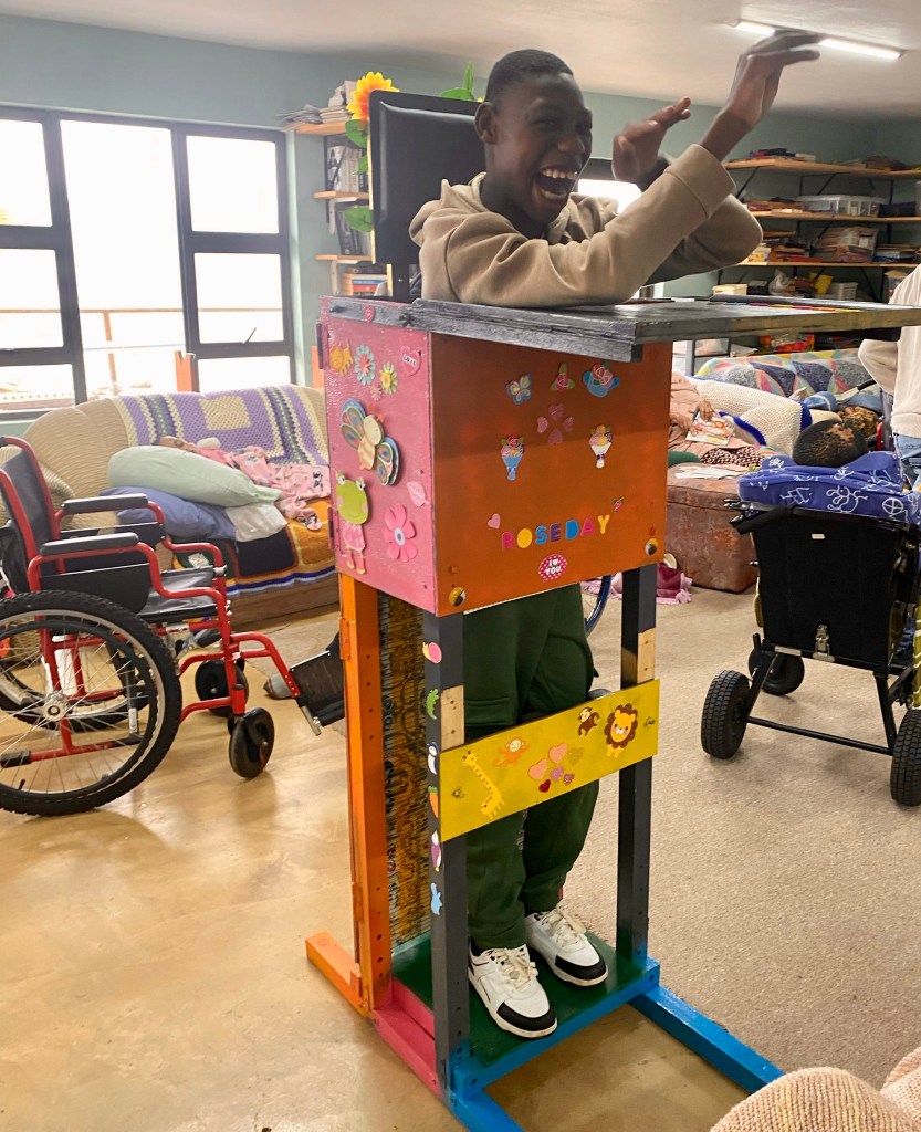 In April we were fortunate enough to receive the donation of a second hand paediatric standing frame, whose previous owner has outgrown it. Here you can see one of our new residents (who happened to be tall enough without adjustments) enjoying the experience and support. Just look at the joyous decorations and colours. What a privilege to have people who continue to think of our residents at Philakade.